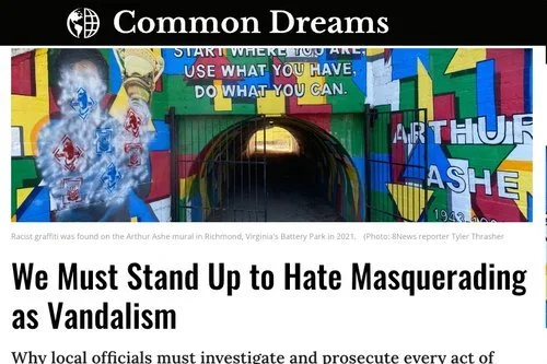 When self-proclaimed white nationalists spray painted over a mural of Arthur Ashe in Richmond, Va., in the fall of 2021, it wasn't just another act of vandalism. It was an American-born form of terrorism that needs to be put down before it spre...